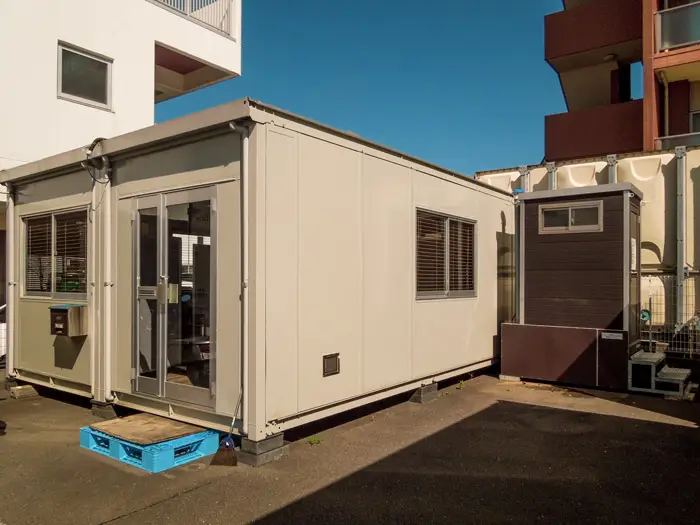 マンションと介護施設に隣接した運輸事業用の事務所で、管理人・配送スタッフ用に仮設バイオトイレ「バイオミカレット」を設置。